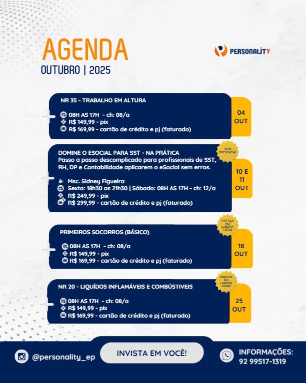 NR 35 – TRABALHO EM ALTURA08H AS 17H – ch: 08/aR$ 149,99 – pixR$ 169,99 – cartão de crédito e pj (faturado)04 OUT DOMINE O ESOCIAL PARA SST – NA PRÁTICAPasso a passo descomplicado para profissionais de SST, RH, DP e Contabilidade aplicarem o eSocial sem erros.SEMI PRESENCIALMsc. Sidney FigueiraSexta: 18h30 as 21h30 | Sábado: […]